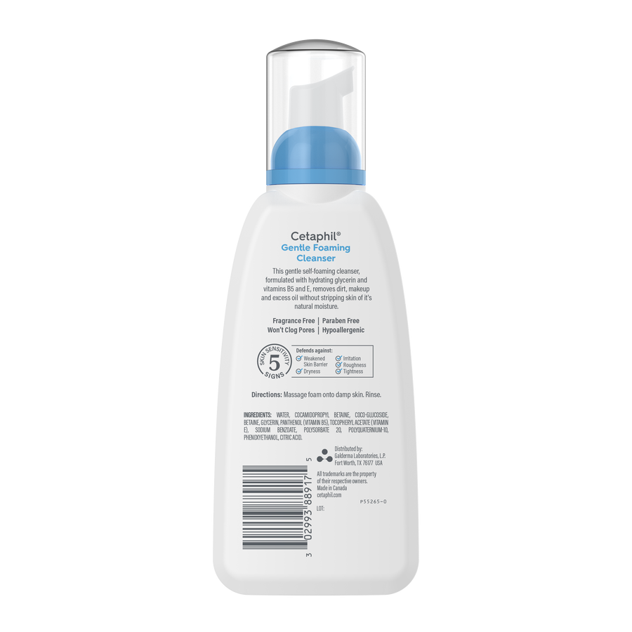 نوع البشرة: للبشرة الجافة إلى العادية والحساسة منظف للوجه لطيف ذاتي الرغوة يزيل بلطف الأوساخ والزيوت والمكياج دون أن يجف للحفاظ على توازن الرطوبة الطبيعي للبشرة. يتكون من الجلسرين المرطب والفيتامينات B5 و E لتنعيمها أثناء تنظيفها تنتج مضخة الرغوة الذاتية رغوة غنية وجيدة التهوية يمكن شطفها بسهولة ينظف بلطف دون أن يترك البشرة جافة أو مشدودة تم اختباره من قبل أطباء الجلدية وثبت سريريًا أنه لطيف على البشرة الحساسة. هذا المنظف اللطيف ذات الرغوة ، المصنوع من الجلسرين المرطب والفيتامينات B5 و E ، يزيل الأوساخ والمكياج والزيوت الزائدة دون أن يجف للحفاظ على توازن الرطوبة الطبيعي للبشرة ويتركها ناعمة. مثالي للبشرة الحساسة والجافة والعادية. يقاوم 5 علامات تدل على حساسية الجلد بما في ذلك الجفاف والتهيج والخشونة والضيق وضعف حاجز البشرة الواقي.