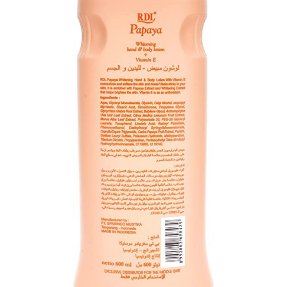 ‏RDI البابايا لتبييض اليد ولوشن الجسم بفيتامين هـ يرطب وينعم الجلد ولا يشعر بالالتصاق على جلدك. المخصب بخلاصة البابايا وخلاصة التبييض التي تساعد على اشراق الجلد يعمل فيتامين هـ كمضاد للأكسدة. المكونات: الماء جليسريل ستورات ،جلسرين كحول سریال سوپروپیل ميريستات حمض دهني علي السيليكون بروسیلین ،جلیگول خلاصة بنر عروس خلابرا بوتیلین جایگول خلاصة فاكهة طليق أسود. خلاصة فاكهة الليمون، خلاصة أوراق موروس اليا، وليسوريات ‏1 PEO- جليسريل دورات توكوفيرول حمض اللينوليك ريتينيل بالميتات أبارك ويثانول، حانة ديليلپیکسل ایدنی مالونات، کابریلیک / كابريك تراي جليسريد، خلاصة فلكية كاريكا البابايا، العطر، لوري الصوديوم / كبريتات هيدروكسيد البوتاسيوم، میتول بالكين، ثاني أكسيد التيتانيوم، ليمونين، سيترال، يوجينول، كلفا ايزوميثيل أيونون، هيكسيل سينامال، البنزيل الساليسيلات، بروبيل بارابين