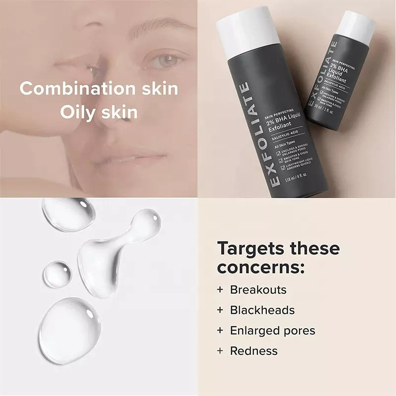 تصبح البشرة باهتة وجافة ومحتقنة عندما تتراكم خلايا الجلد الميتة على سطحها. يحاكي حمض بيتا هيدروكسي (BHA ، المعروف أيضًا باسم حمض الساليسيليك) عملية التقشير الطبيعية للبشرة الشابة من خلال مساعدتها على التخلص من طبقات إضافية أثناء إزالة انسداد المسام وتنظيفها. ثبت سريريًا قدرته على تفتيح البشرة وترطيبها وتقليل ظهور الخطوط الدقيقة وتحسين حاجز البشرة في 4 أسابيع. منتجنا رقم 1 في جميع أنحاء العالم + المفضل لدى العبادة ، هذا المقشر اللطيف الذي يترك على البشرة والذي ثبتت فعاليته سريريًا مع حمض الساليسيليك يفتح المسام بسرعة وينعم التجاعيد ويوحد لون البشرة. * ينقي المسام المتضخمة ويقللها ‏ * BHA (حمض بيتا هيدروكسي) يلقي طبقات الجلد المتراكمة * قوام سائل وخفيف الوزن يمتص بسرعة * يُستخدم مرتين يوميًا بعد تنظيف البشرة وتوحيد لونها المكونات الرئيسية التي تصنع الفارق حمض الصفصاف: + ينظف المسام المتضخمة ويقللها + تقشير طبقات الجلد المتراكمة + يقلل بشكل واضح الخطوط الدقيقة والتجاعيد شاي أخضر: + يلطف التهيج + فوائد قوية لمكافحة الشيخوخة + يحسن بشكل واضح أضرار أشعة الشمس