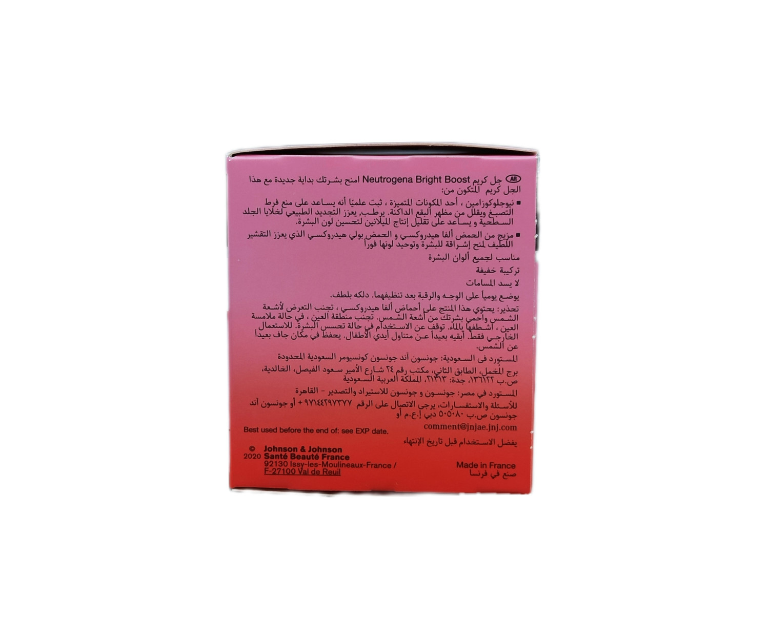 جل كريم Neutrogena Bright Boost امنح بشرتك بداية جديدة مع هذا الجل كريم المتكون من: نيوجلوكوزامين ، أحد المكونات المتميزة ، ثبت علميا أنه يساعد على منع فرط التصبغ ويقلل من مظهر البقع الداكنة. يرطب يعزز التجديد الطبيعي لخلايا الجلد السطحية ويساعد على تقليل إنتاج الميلانين لتحسين لون البشرة. مزيج من الحمض ألفا هيدروكسي و الحمض بولي هيدروكسي الذي يعزز التقشير اللطيف لمنح إشراقة للبشرة وتوحيد لونها فوراً مناسب لجميع ألوان البشرة تركيبة خفيفة لا يسد المسامات يوضع يوميا على الوجه والرقبة بعد تنظيفهما. دلكه بلطف تحذير: يحتوي هذا المنتج على أحماض ألفا هيدروكسي ، تجنب وضعه حول العين و التعرض لأشعة الشمس المباشرة وضع كريم الحماية قبل التعرض للشمس.