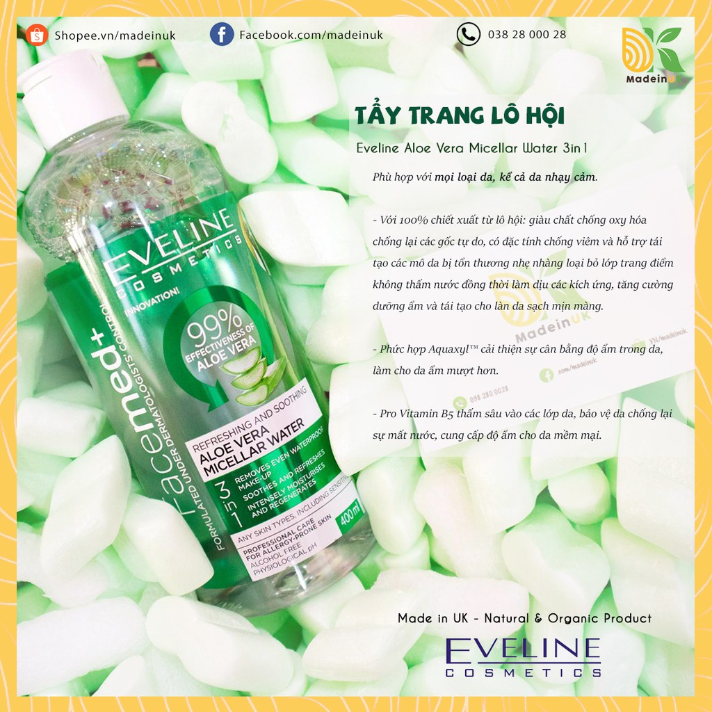 Eveline Cosmetics FaceMed + 3 in 1 Aloe Vera Micellar Water لجميع أنواع البشرة (400 مل) هو عامل تنظيف مبتكر للوجه يزيل بشكل فعال المكياج المقاوم للماء ويلطف التهيج ويرطب بشكل مكثف ويجدد البشرة. تم تطوير ماء Aloe Vera micellar بالتعاون مع أطباء الجلد الرائدين ، وقد تم تصميمه خصيصًا لتنقية البشرة الحساسة. بالإضافة إلى احتوائه على الألوة فيرا ، المعروف بخصائصه المنعشة والمهدئة ، يحمل ماء ميسيلار أيضًا مكونات طبيعية ، بما في ذلك عصير أوراق الصبار وبروفيتامين ب 5. تتحد هذه العناصر للعناية بالبشرة الحساسة المعرضة للتهيج ، خاصة أثناء إزالة المكياج. خالية من الكحول. خالٍ من القسوة وصديق للنباتيين.