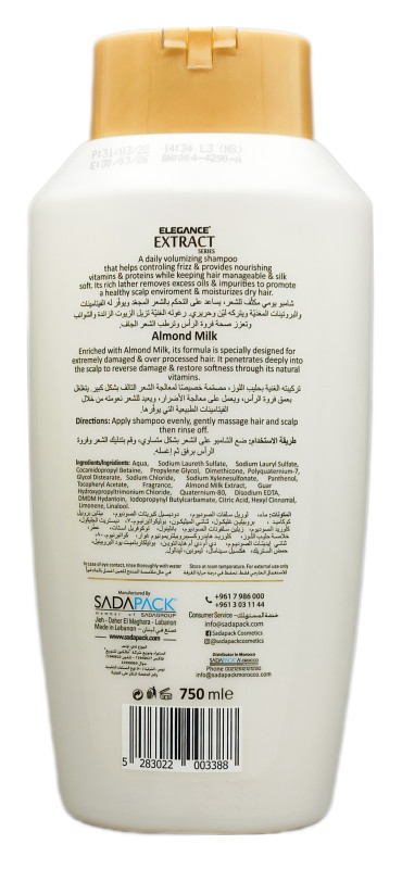 شامبو اليجانس بخلاصة حليب اللوز ينظف الفورة بلطف ويزيل الاوساخ والبكتريا ويجعل الفروة ارض صالحة لنمو شعر جديد وصحي ، يرطب ويتحكم بتجعد الشعر ويتركه لامع وحيوي .