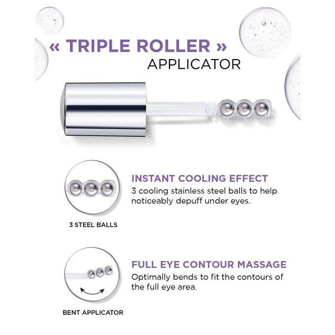 1.5٪ حمض الهيالورونيك نقي ، 1٪ سيروم كافيين نقي للعين لازالة الانتفاخ وتقليل ظهور التجاعيد. قضيب تبريد "بكرة ثلاثية" لتدليك محيط العين بالكامل للمساعدة على إزالة انتفاخ أسفل العينين بشكل ملحوظ. عيون تبدو أصغر سنا وأقل تعبا. مع مرور الوقت ، تبدو الهالات السوداء أكثر إشراقًا بشكل ملحوظ. المكونات : AQUA / WATER GLYCERIN HYDROXYETHYLPIPERAZINE ETHANE SULFONIC ACID NIACINAMIDE SODIUM HYALURONATE CAFFEINE CITRIC ACID HYDROXYACETOPHENONE TRISODIUM ETHYLENEDIAMINE DISUCCINATE ASCORBYL GLUCOSIDE CAPRYLYL GLYCOL CHLORPHENESIN.