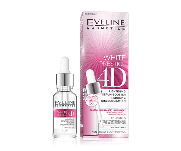 سيروم التفتيح والتبييض وإزالة التصبغات 4 دي وايت برستيج 18مل - ايفيلين OA670-1 " عرض خاص" سيروم التفتيح والتبييض من سلسلة مستحضرات التجميل WHITE PRESTIGE 4D هو علاج مستوحى من العلاجات الاحترافية للتبييض بالليزر يعمل على التقليل من تغير اللون ويعطي نتائج مثل العلاج بالليزر الاحترافي. أبرز فوائد سيروم التفتيح والتبييض ♦ يمكن لسيروم التفتيح والتبييض من ايفيلين أن تحسن من تماسك البشرة بسرعة وفعالية، مع تفتيح البشرة وتقليل تغير اللون. ♦ يمكن أن يقلل من تغير اللون، تمامًا مثل العلاج بالليزر الاحترافي في صالون التجميل. ♦ سيروم التفتيح والتبييض مناسب لجميع أنواع البشرة وخاصة للبشرة الحساسة بتركيبة غير دهنية وخفيفة الوزن. ♦ يعمل في أربعة اتجاهات لتفتيح وتبييض ومنع التصبغ وتحسين لون وصحة البشرة بشكل عام. أبرز المكونات الفعالة ♦ مركب FRACTO2 ILLUMI LASER +Lumiwhite يعمل على إضاءة وتحسين هيئة البشرة وينعمها وبالتالي يقلل من تغير اللون. ♦ حمض الهيالورونيك: يربط الرطوبة في الطبقة الخارجية من الجلد بأعمق طبقة من الجلد حيث يمنع الرطوبة من التبخر من الطبقة السطحية من الجلد بسرعة ويبقيها تدوم لفترة طويلة. ♦ كولاجين الأكاسيا: يكافح التجاعيد ويحسن كثافة البشرة ويدعم نضارتها.