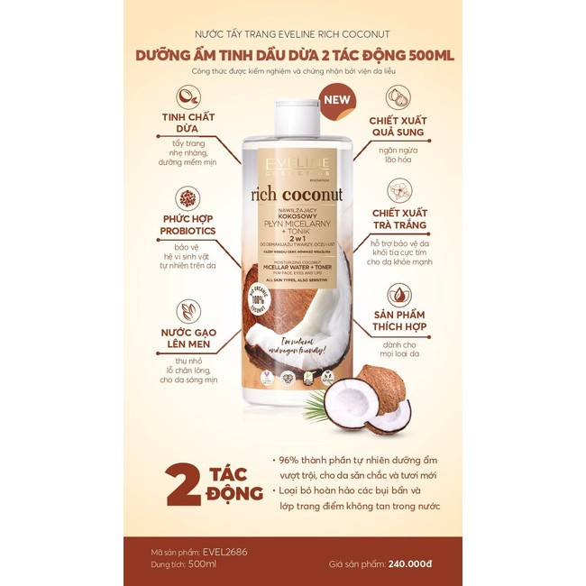 ايفيلاين- ريتش جوز الهند - المرطب للوجه ميسيلار - سائل ومزيل مكياج تونر - 500 مل سائل ميسلر ومنعش ومنعش بشكل طبيعي في آن واحد. سوف يزيل بشكل فعال حتى أكثر أنواع المكياج مقاومة للماء ، مما يترك البشرة نظيفة ومغذية بشكل ممتع! تحتوي تركيبة السائل على الهيدروجين الحيوي لجوز الهند.